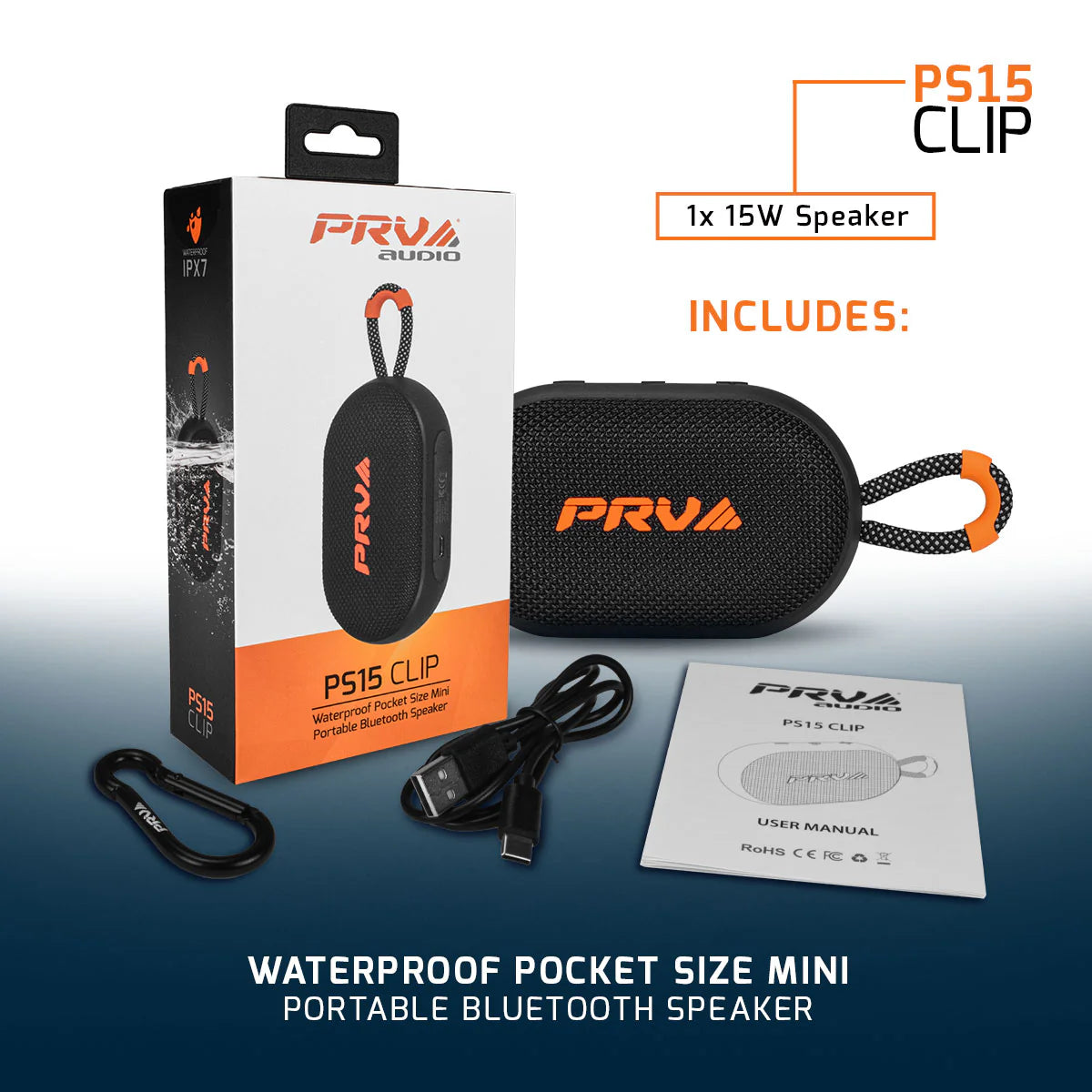 The mini & powerful PRV PS15 CLIP portable waterproof bluetooth speaker delivers clear, loud PRV Audio Sound with rich, punchy bass. It features a pocket-size design and a hook-on clip for easy portability.